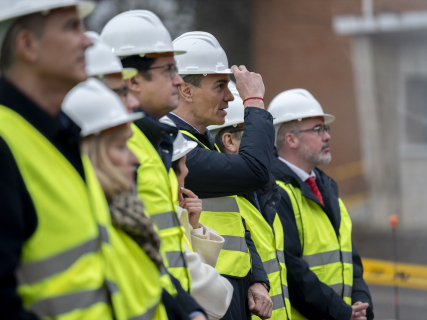 El presidente del Gobierno, Pedro Sánchez (centro), durante el acto de demolición de los primeros edificios del acuartelamiento de Campamento, a 12 de enero de 2026, en Madrid | Alberto Ortega / Europa P