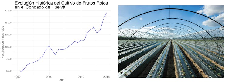 Por otro lado, durante los últimos 30 años se ha producido un gran crecimiento del cultivo de frutos rojos en invernadero a lo largo de toda la corona norte del parque, que abastece de frutos rojos a España y Europa, y que ha adquirido una gran importancia socioeconómica en los municipios colindantes.